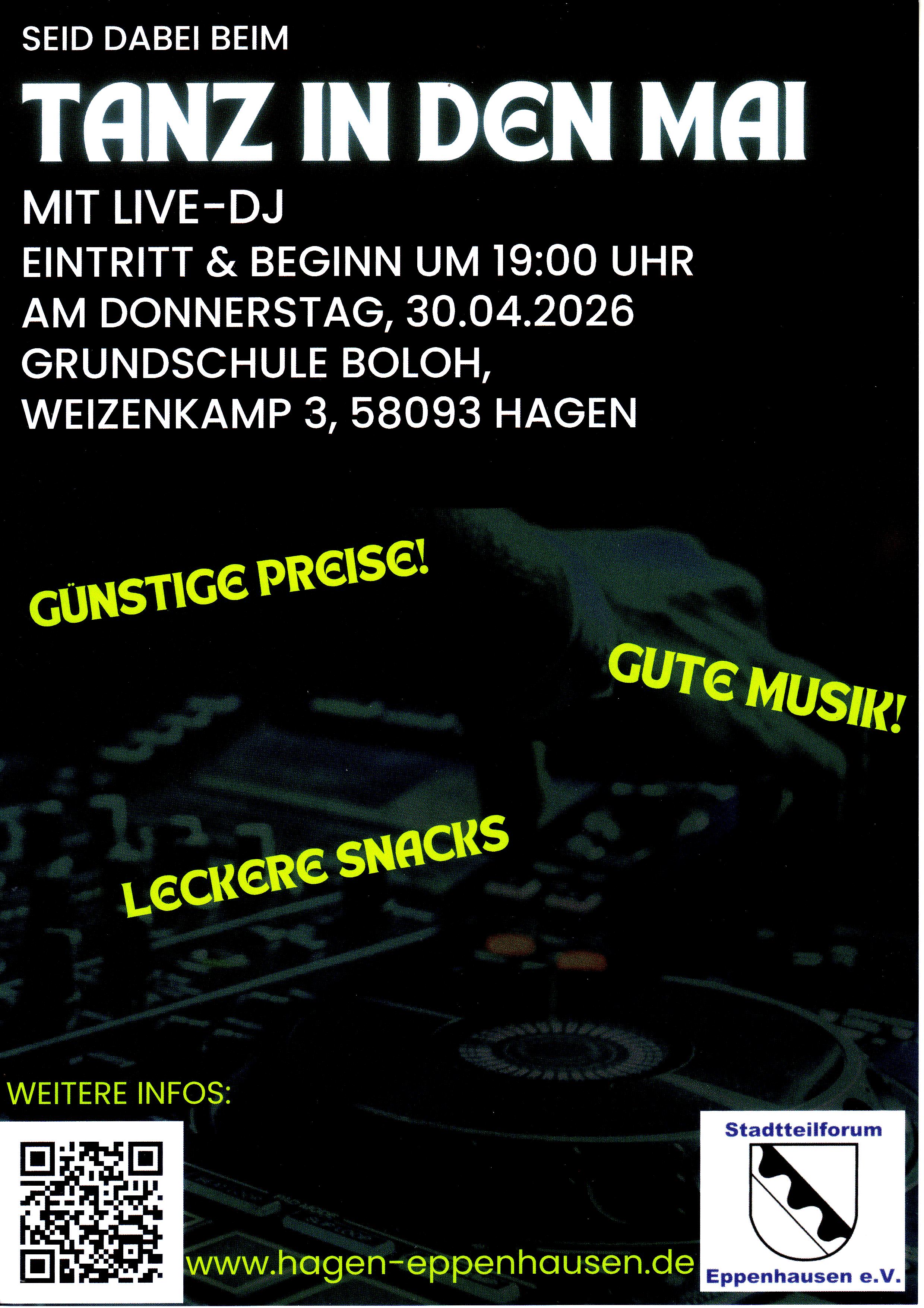 Am Donnerstag, 30.04.2026 veranstaltet die Eppenhauser Kulturgemeinschaft einen Tanz in den Mai. Vor der Veranstaltung wird um 18:30 Uhr der Maibaum gesetzt. Veranstaltungsort: Bolohschule. Weizenkamp. Beginn: 19:00 Uhr Ende offen